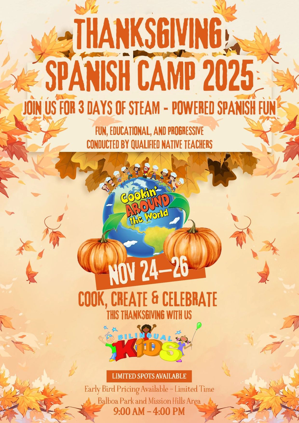 Have an immersive experience! In this camp, your children will have a blast, all the while learning and enhancing their language skills, cook their own lunch all conducted in Spanish! In addition, students will create crafts to enhance the decor to your Thanksgiving family table and bring crafts that can serve as a wonderful conversation piece!